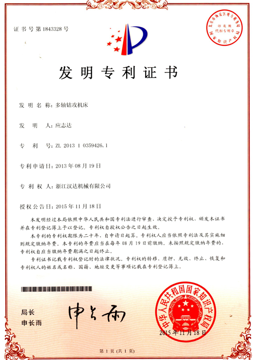 1月7日,公司首個發明專利“多軸鉆攻機床”證書到手