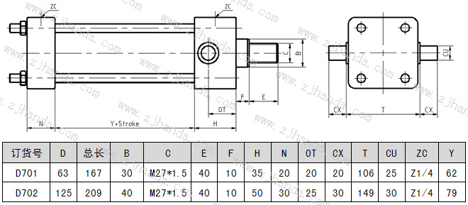 前銷軸安裝的低壓拉桿液壓缸的尺寸圖及參數