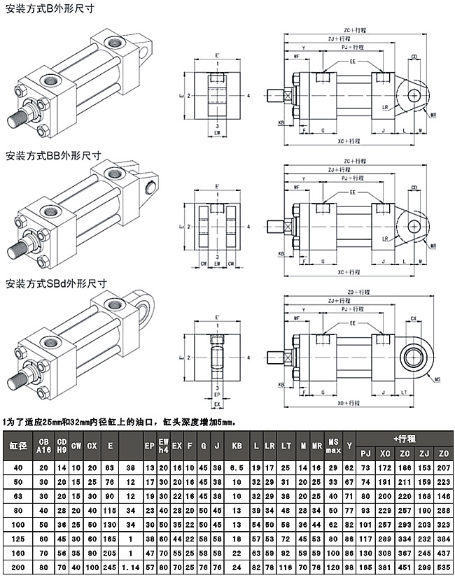 以下為YGD標準液壓缸B\BB\SBd四拉桿液壓缸具體參數,客戶可按照以下圖表來選型。